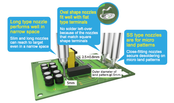 A wide selection of nozzle, with the addition of new types, is available for a variety of desoldering works.