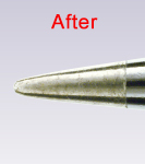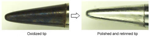 NOTE:When the tip temperature is over 400ºC, even if the oxidation film is removed by "HAKKO FT-700 tip polisher", the tip can turn to be oxidized quickly again.