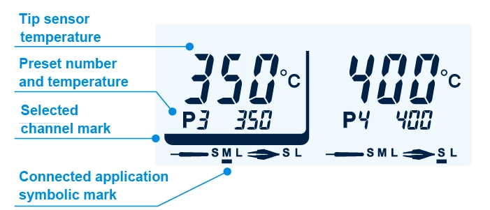 It shows information such as set temperature, tip's sensor temperature, and preset setting, clearly and widely.
