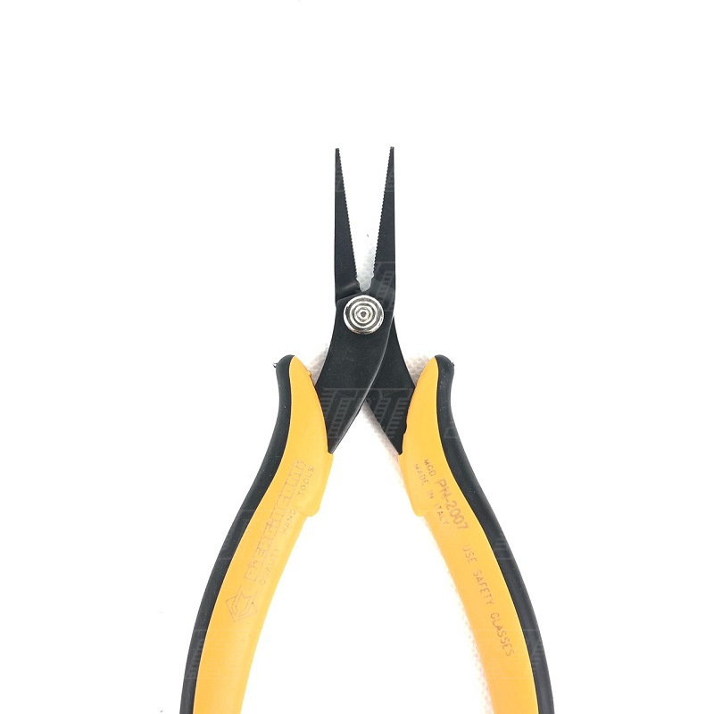 PN 2007: The PN 2007 is a serrated, flat long nose pliers ideal to be used in difficult to reach areas. Steel thickness 3.0mm. ESD-safe handles version available.