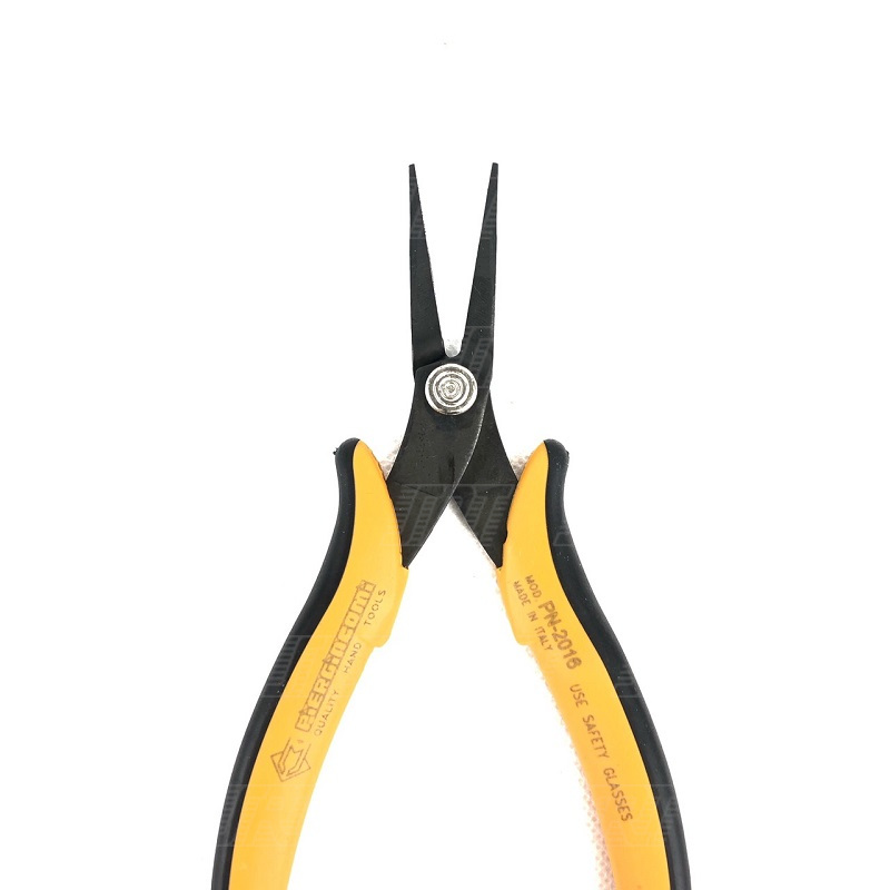 PN 2016: Smooth pointed, long nose pliers, with rounded external edges suitable for the handling of components in high density areas without causing damage. Steel thickness 3.0mm. ESD-safe handles version available.