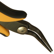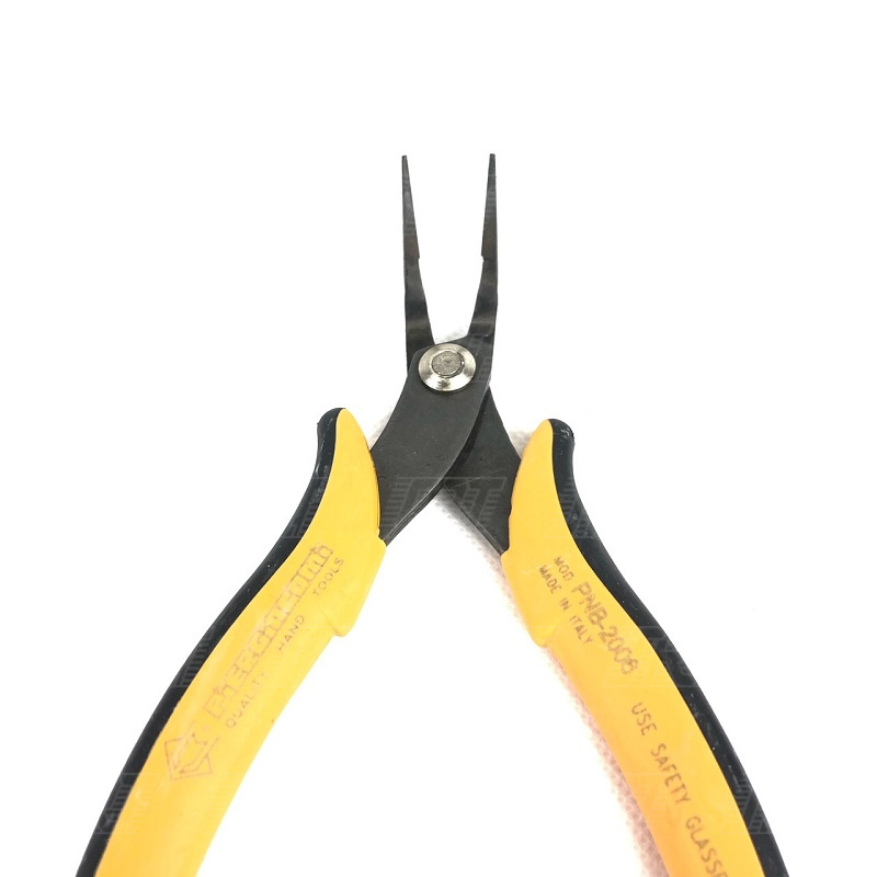 PNB 2006: Smooth pointed long nose pliers bent at 45°. Thanks to its shape, it gives a wide angle of vision of the work area and suitable for the handling of components in difficult to reach areas. Steel thickness 3.0mm. ESD-safe handles version available.